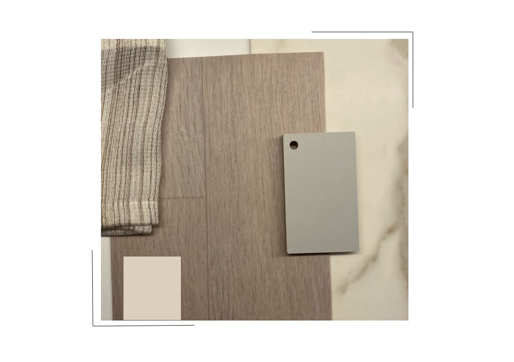 Omdat ik natuurlijk al had gekozen voor een wat vergrijsende kleuren en zachte kleuren heb ik gekozen om de vloer een rustige maar wat koelere kleur te geven, en de keuken grijze meubelpanelen en een marmer keukenblad.
